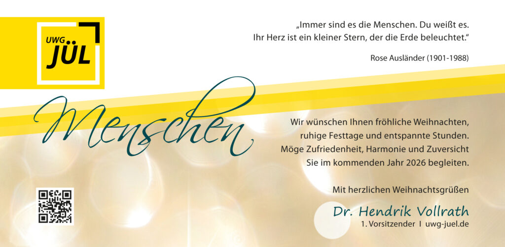 AktuellesWir wünschen Ihnen allen frohe Weihnachten und ein glückliches und gesundes neues Jahr Veröffentlicht am 23. Dezember 202523. Dezember 2025 von Hendrik Vollrath 23 Dez. Hendrik Vollrath Neuer Flächennutzungsplan – entscheidend für Jülich Weihnachtsgrüße unseres Vorstandsvorsitzenden Dr. Hendrik Vollrath
